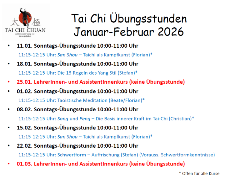 Im Anschluss besteht die Möglichkeit an dem wöchentlich stattfindenden Sonderkurs teilzunehmen, in dem wir gemeinsam wechselnde Aspekte des authentischen Yang-Stils üben. Dazu gehören unter anderem taoistische Meditation ebenso wie 'San Shou' (der Kampfkunstaspekt des Tai Chi) oder die Partnerübung des 'push hands'.
